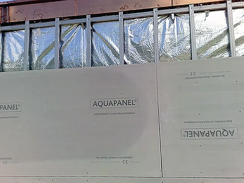 - Обшивка каркаса с помощью листов аквапанель Knauf. Монтаж можно делать только на каркас из качественных жёстких профилей, клеить листы как гипсокартон не получится из-за большого веса.