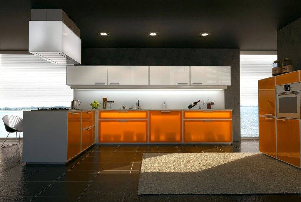 Большинство производителей использует для производства пластик, МДФ или ДСП. Это более доступный вариант, который подходит под любой дизайн. Среди МДФ или ДСП легко выбрать подходящий цвет и декор. Плиты просты в обработке, алюминиевая рама создает дополнительную защиту от влаги. Кухня надолго сохраняет внешний вид.