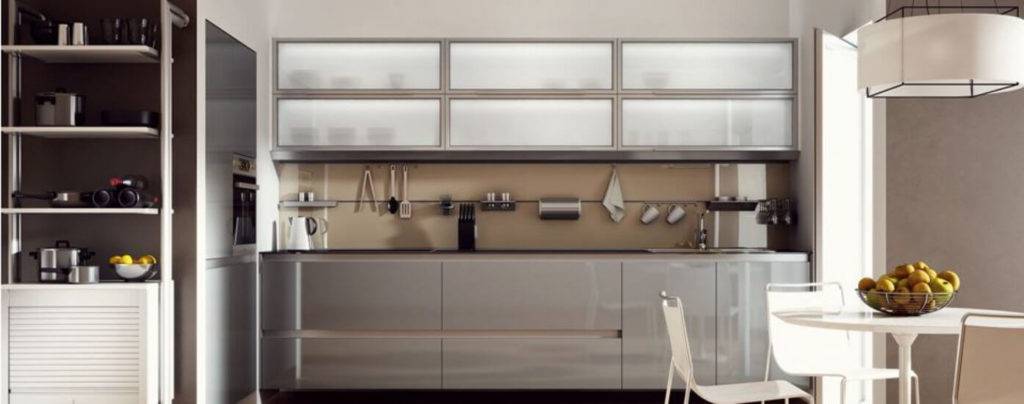 Для кухни алюминиевые фасады находка дизайнеров и проектировщиков мебельных гарнитуров. Модные стили минимализм, лофт и техно отдают предпочтение материалам с серебристой и зеркальной поверхность. Кухни имеют небольшую площадь, заставленную мебелью и оборудованием. Такие фасады легко отмываются, не меняют цвет при попадании горячего жира и пара.