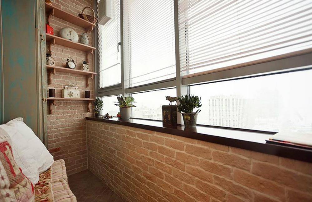 Оконные рамы можно сделать из деревянных пород, а к окну должен прилегать широкий подоконник. Это место может стать идеальной полкой для растений. Под подоконником небольшие шкафчики с отделкой для хранения вещей. Под окном можно вмонтировать стол, который можно убрать в специальную нишу (подробнее читайте в статье “откидной столик на балкон“). В маленькое пространство лучше ставить складные стулья.