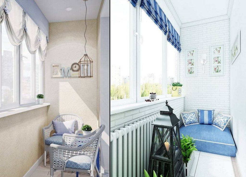 Стены можно покрыть деревянными панелями или белой кирпичной кладкой. Шкаф без дверок лучше поставить около стены. В качестве украшений рекомендуется выбрать настоящие комнатные растения. Вариант оформления лоджии подразумевает сочетание с другими стилями, чтобы добиться ощущения «городского Прованса».
