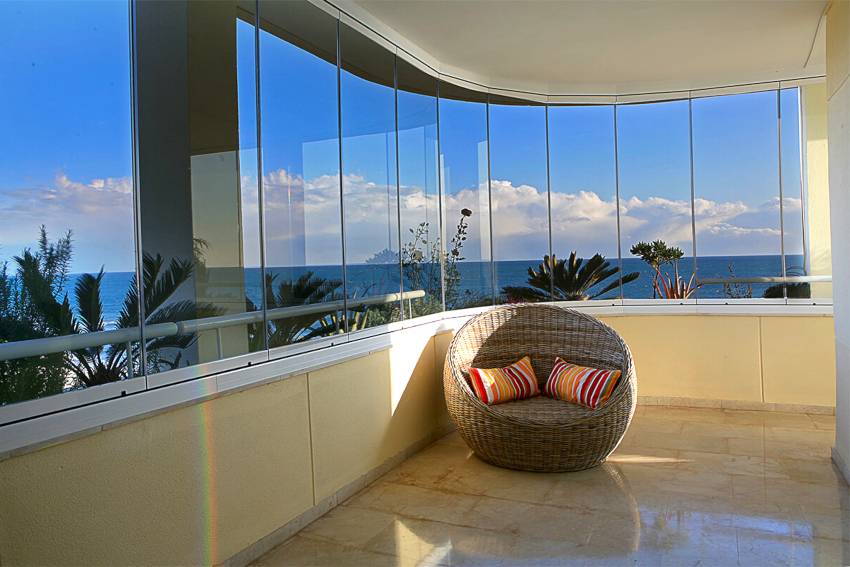 Безрамное панорамное остекление находит достойное применение в интерьере балконов и лоджий. Как было сказано ранее, благодаря отсутствию рам создается иллюзия целостности единого большого стекла. Данная конструктивная особенность дает возможность получить практически уникальный вид на окрестный город, не ограничивающий обзор рамами.