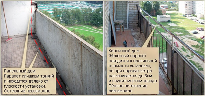 В домах старых серий балконный парапет был металлическим или из тонких железобетонных плит. Оба варианта давно исчерпали свой ресурс и не могут выдерживать не то что дополнительных, но и первоначальных расчетных нагрузок. Их нужно обязательно демонтировать и сооружать новые конструкции.
