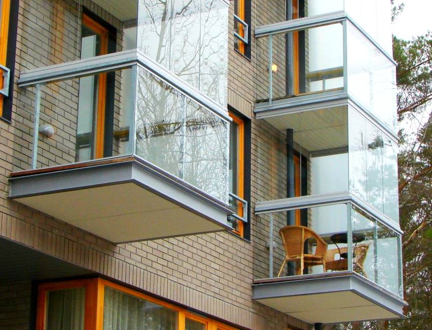 - Стильный облик балкона, фасада в целом. Стеклянные панели без дополнительной окантовки выглядят намного привлекательнее, чем «решетчатые» рамные конструкции.