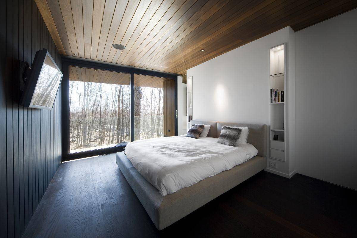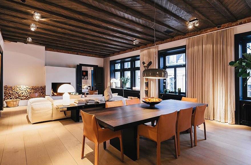 Это современный, яркий стиль. Для него характерны тёмные тон, чёткая геометрия. Потолок (если позволяет площадь) можно сделать чёрным. Но не полностью из дерева, часть стоит оставить бетонно. Это добавит антуража.
