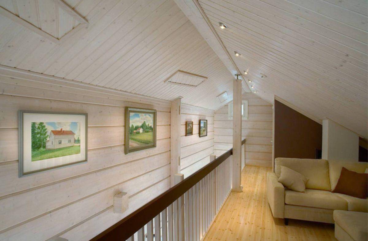 Блок хаус. Этот вариант вагонки отличается от предыдущего своей формой. Она выпуклая и полукруглая. При монтаже такие доски напоминают сруб натурального дерева. Именно из-за выпуклой формы и имитации деревянного сруба дизайнеры не рекомендуют использовать её в качестве потолочного покрытия. Поскольку это смотрится не совсем эстетично и громоздко.