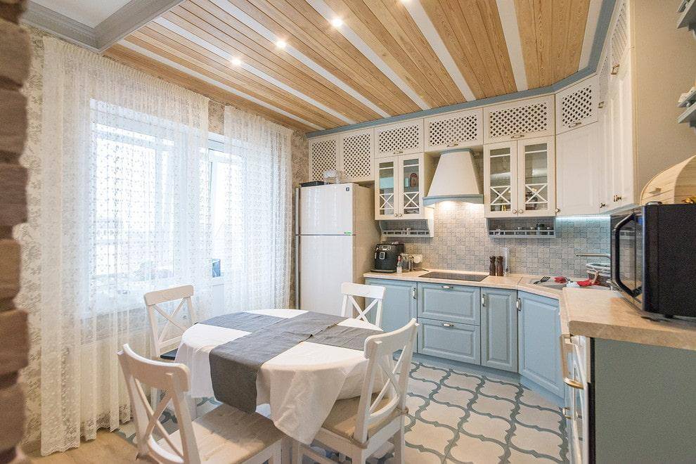 Потолок вагонкой в голубом цвете выглядит невероятно стильно и свежо. Его особенность: универсальность для любого стиля. Будет гармонично смотреться как с классическими, так и с современными направлениями.