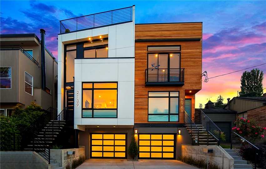 - Навесной фасад, изготовленный из профнастила. На фото можно увидеть, что данная система является внешне очень современной и эффектной. Листы металлического профиля можно обработать при помощи различных покрытий, которые будут обеспечивать необходимую защиту всему дому. Это могут быть как профилированный материал, так и полимерный.