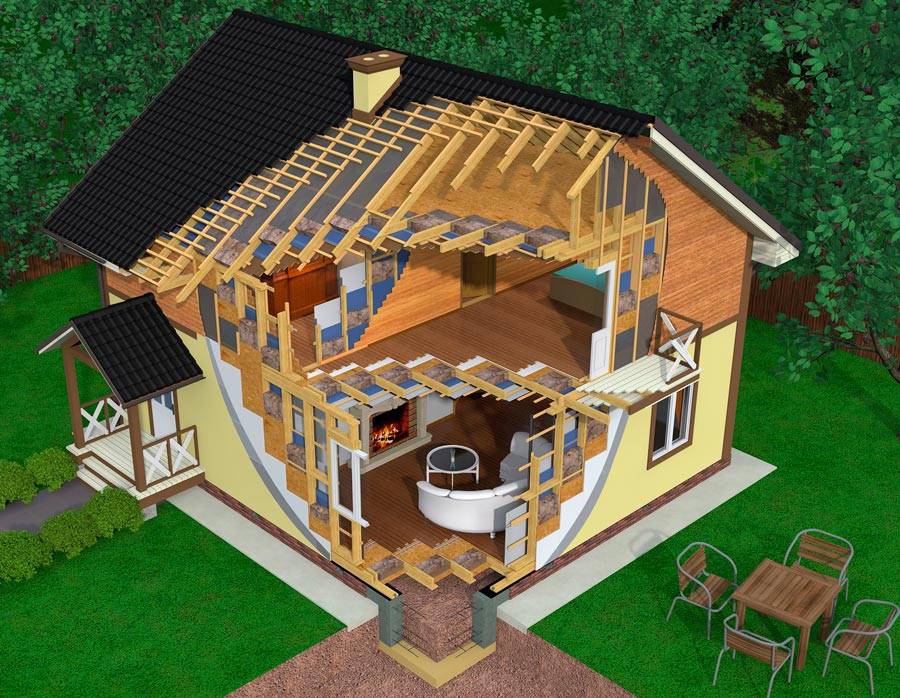 Стены имеют вид пирога – несколько слоёв разных материалов, укрепленных внутри каркаса и обшитые панелями. При этом, для предотвращения попадания влаги снаружи (плюс – защита от ветра), а также для недопущения накапливания конденсата внутри стенок, обязательно руководствоваться правилами: с наружной части дома натягивается ветрозащита, а со стороны помещений – парозащитная плёнка. В результате «начинка» пирога, представленная утеплителем, будет «дышать», но не намокнет и не потеряет своих свойств.