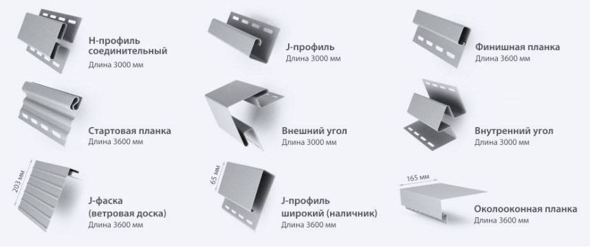 Комплектующие или доборные элементы для металлосайдинга по многим параметрам схожи с комплектующими для винилового сайдинга и включают в себя углы для внешней и внутренней отделки, наличники, завершающую полосу, соединительную рейку и стартовую полосу.