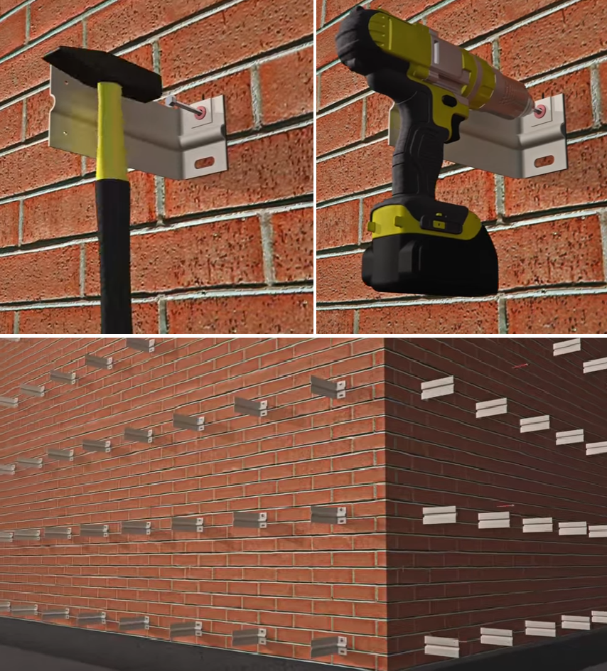 Поскольку форма камней относительно правильная, их стремятся установить как можно ближе друг к другу. Тем самым минимизируют швы. На фасадных профилях имеются специальные тонкие пластины, которые отгибают после установки камней. Таким образом обеспечивается дополнительное крепление облицовочного слоя.