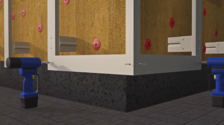 Шаг 6. Устанавливают вертикальные направляющие, фиксируя их к кронштейнам анкерами.