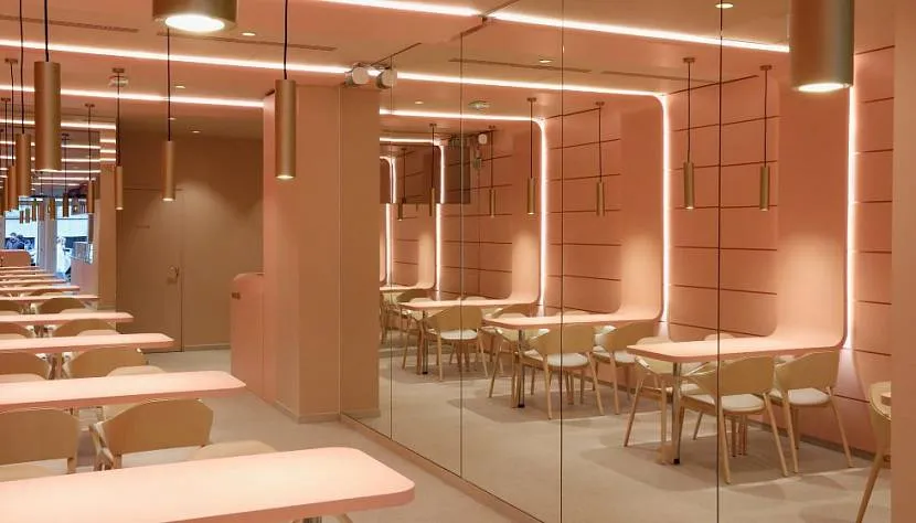 Просторное заведение так же предполагающее самообслуживание. В столовых проводятся торжества и банкеты, поэтому в дизайне интерьера продумываются разные способы расстановки мебели.