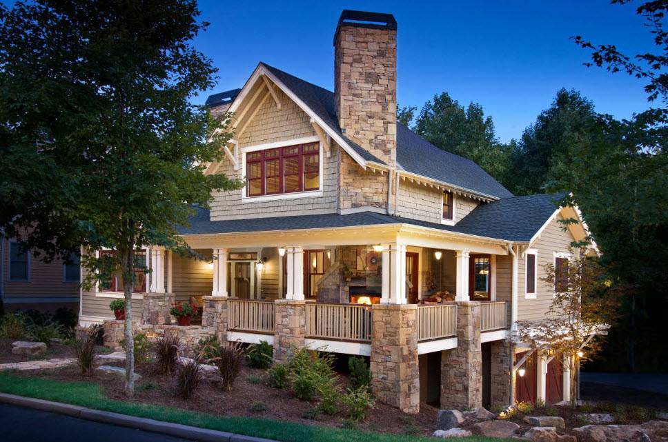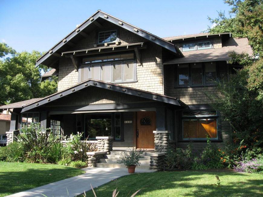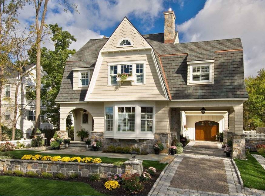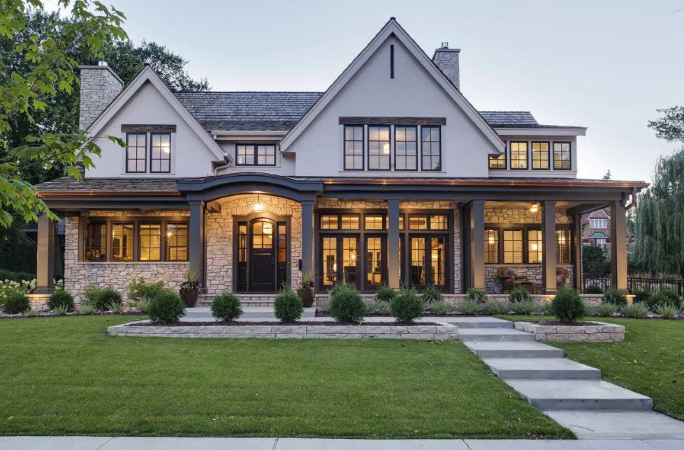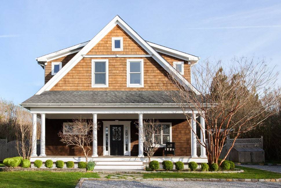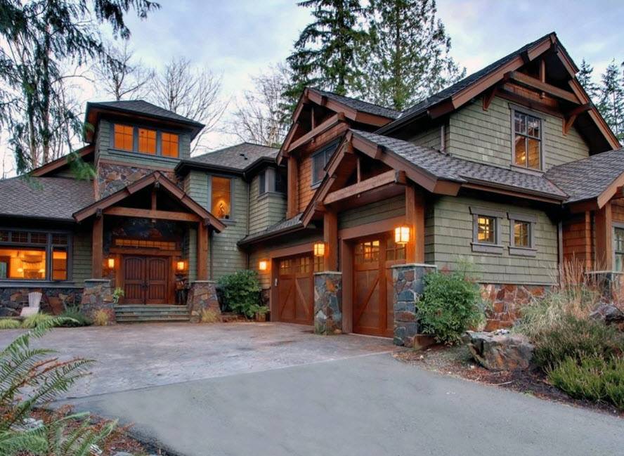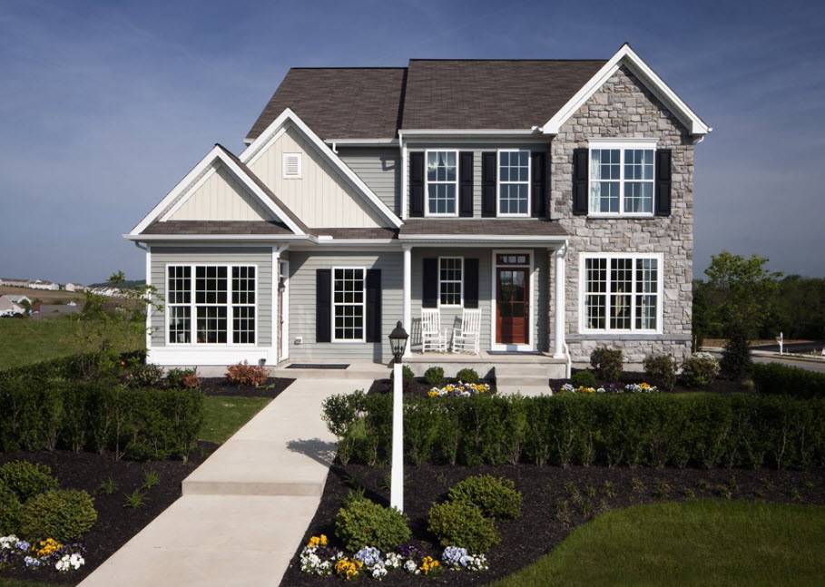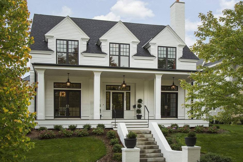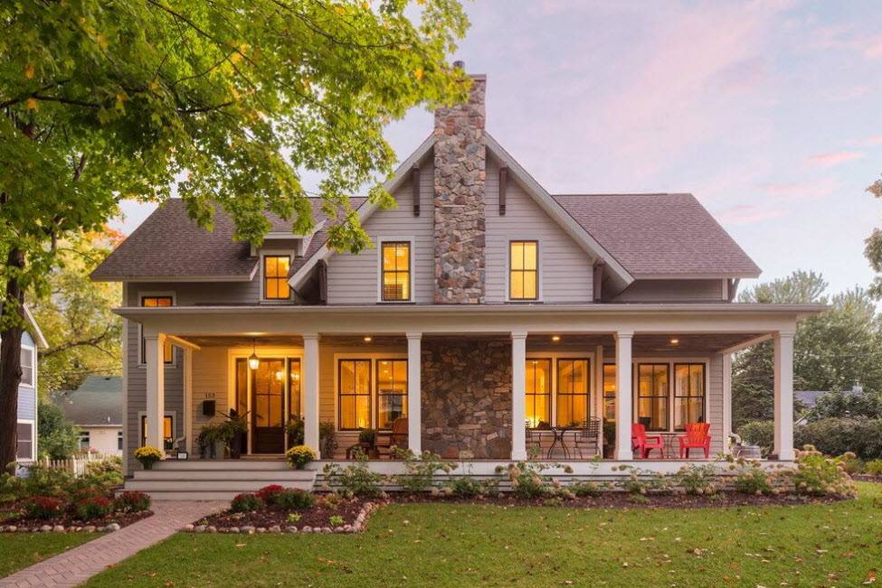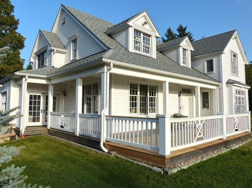 Строительство загородных коттеджей в американском архитектурном стиле ведется с использованием любых материалов – кирпича, бетона, бруса, бревна или камня. Но в классическом американском исполнении дома делают с применением каркасных технологий. Каркасные дома быстро возводятся, стоят недорого, отличаются комфортом и высокой теплоэффективностью. В оформлении экстерьера согласно принципам американского стиля преобладают спокойные, нейтральные оттенки, прямые и строгие линии. Для отделки фасадов дома применяют искусственную штукатурку или деревянную обшивку. Можно комбинировать оба варианта, внося в оформление экстерьера разнообразие. Также часто используют фасадный клинкерный кирпич, фасадные панели, сайдинг и блок-хаус. Если дом выполнен из клееного бруса, дополнительная наружная и внутренняя отделка ему не понадобится, поскольку клееный брус смотрится эффектно и привлекательно сам по себе. Цоколь дома облицовывают плиткой или кирпичом.