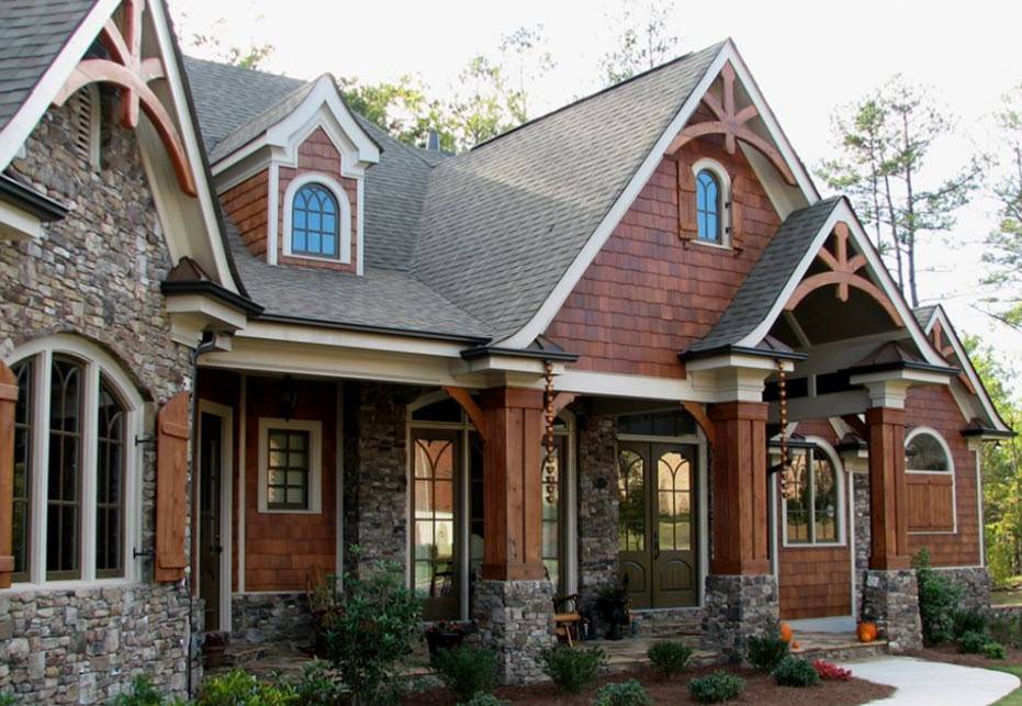 Цоколь выделяют натуральным камнем. Проф. настил редко используется для кровли, чаще всего черепицы.