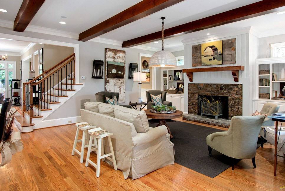 Потолок выполнен в спокойных светлых тонах. В качестве дополнительного декоративного элемента можно использовать потолочные балки, окрашенные в контрастные тёмно-коричневые цвета. Можно также использовать молдинги, цвет которых будет гармонировать с потолком.