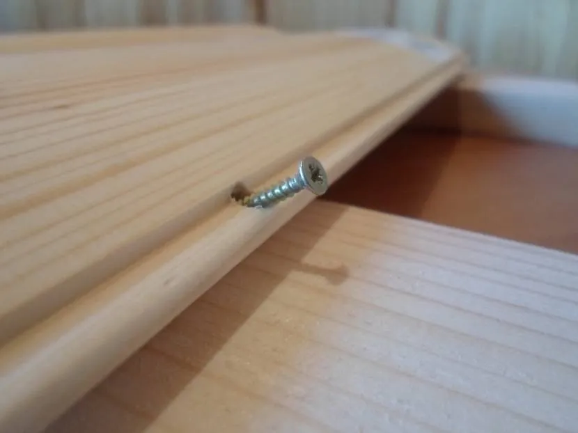 - Второй вариант предусматривает крепление панели к бруску обрешетки саморезами. Для этого в доске нужно сделать отверстие, равное половине ее толщины. После чего в отверстие отапливается шуруп, и потом дырка конопатится заподлицо с доской, как показано на видео. Теперь блок хауз надежно закреплен, при этом шляпка шурупа не видна. Способ трудоемкий и есть риск повреждения ламели в процессе монтажа.
