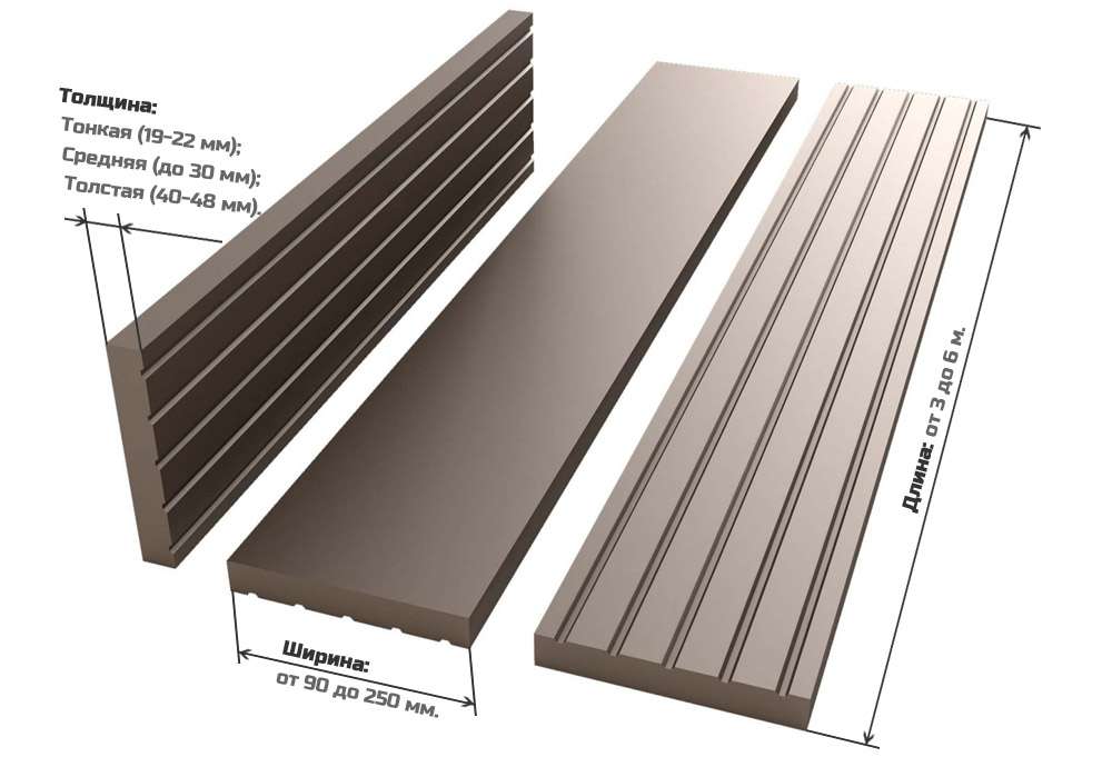 Ширина террасной доски варьируется от 90 до 250 мм.