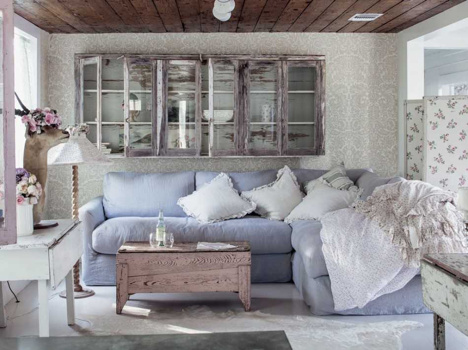 При выборе мебели не забывайте отдавать предпочтение натуральным материалам, избегайте пластиковых и стеклянных деталей. Искусственно созданные потёртости и состаренные поверхности станут изящным украшением и гармонично впишутся в стиль.