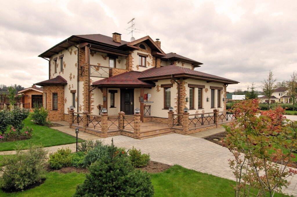 Использование сочетаний различных материалов для отделки фасад Но промышленное колерование смеси дает намного лучший результат: цвет получается насыщенный и чистый, именно такой, какой задуман. Кроме того, готовые краски могут включать фракции различных цветов, что значительно повысит декоративные качества. Поэтому при выборе покрытия для стен стоит трезво оценить свои силы, возможности и желания: в случае, если цена готовой смеси вписывается в бюджет, лучше ее и приобретать.