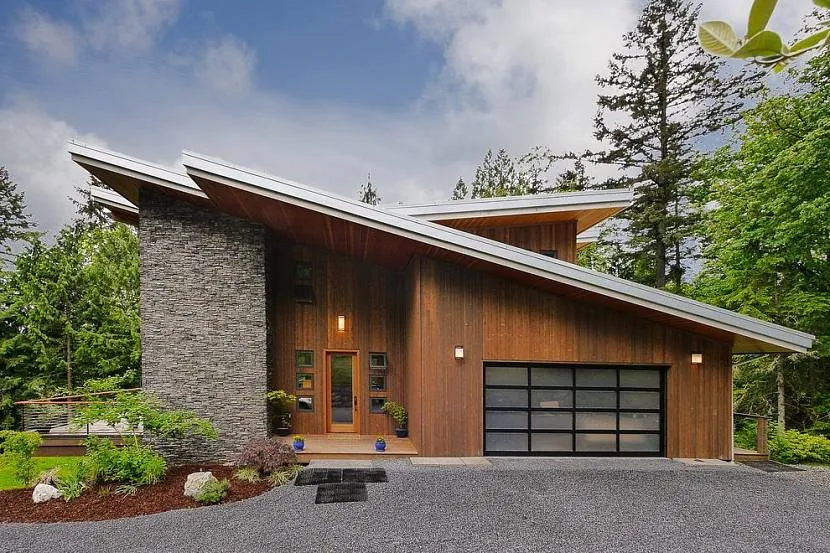 Дом, выполненный в стиле модерн, отличается отсутствием симметрии, интересными сгибами и облицовкой из натуральных отделочных материалов (камень, дерево). Но допускаются и некоторые искусственные (пластик, композитные панели, металл).