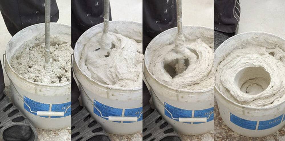 Сначала рекомендуется наложить в нее 6 шпателей смеси, и смешать с водой до однородной консистенции. Размешивание проводите строительным миксером, чтобы не оставались комки. Если масса слишком жидкая, всыпьте еще немного сухой смеси.