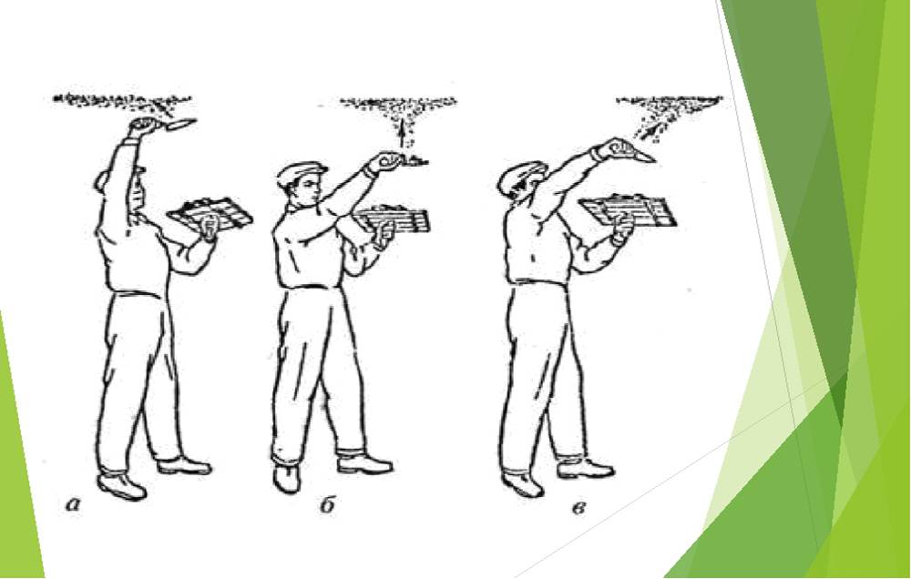 Готовую смесь нужно наносить на основу в течение трети часа. Работы на полотке осуществляются с помощью сокола. Движения должны быть по направлению к себе.