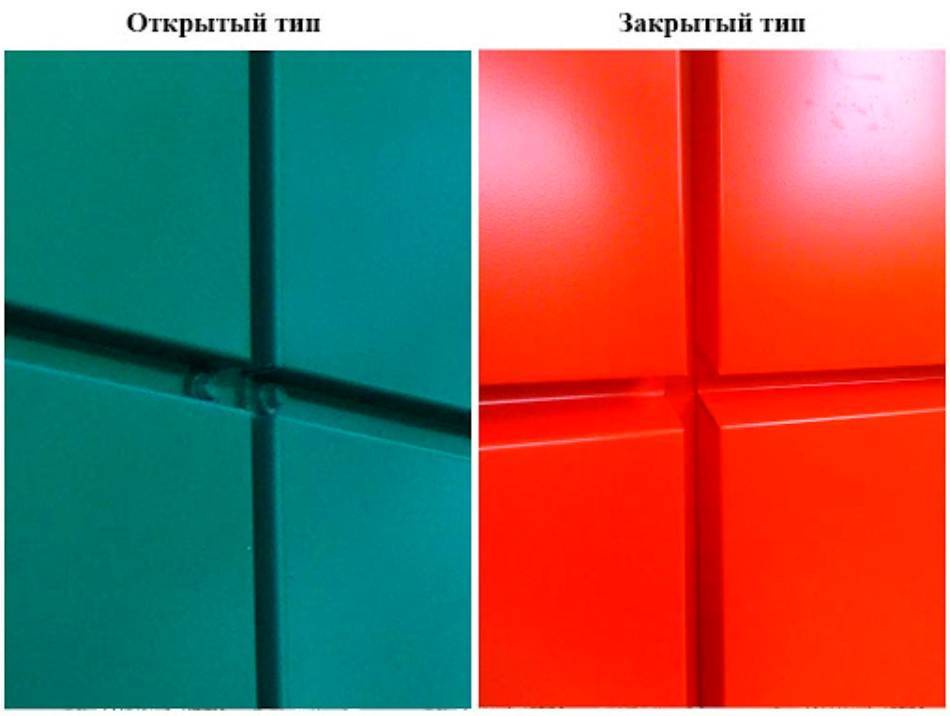 Кроме того, кассеты имеют два вида креплений: скрытое и открытое. При скрытом варианте у квадрата по верхней стороне имеется отгиб, на который крепиться специальная планка. Эта планка, в свою очередь, цепляется за нижнюю сторону вышележащего ряда. Но минус такой системы в том, что замену поврежденной панели будет произвести очень непросто.