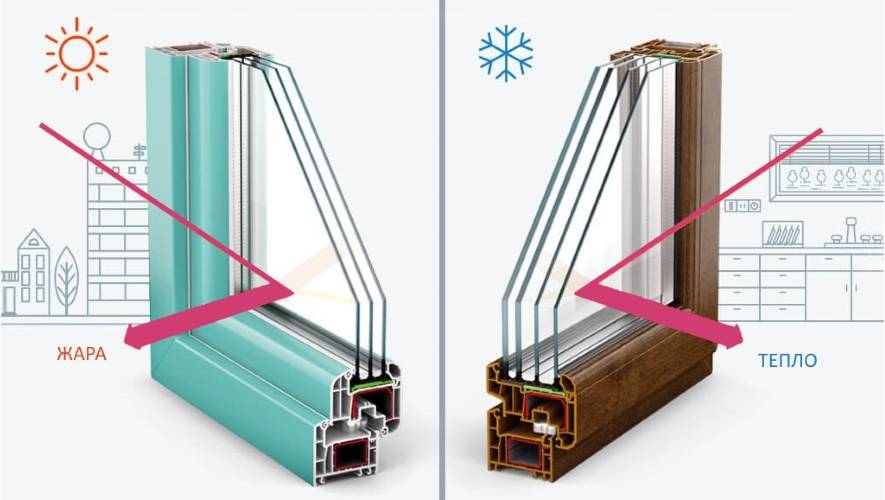 То есть при равном числе камер энергосберегающие окна из ПВХ-профиля почти вдвое эффективнее сохраняют тепло в комнате, чем простые.
