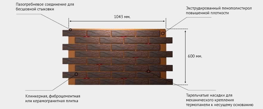 ВАЖНО! Срок службы термопанелей напрямую зависит от эксплуатационного срока используемого утеплителя, обычно составляет до 25 лет. Декоративная основа, защищающая утеплитель от атмосферных осадков и ультрафиолета, представлена клинкерной плиткой, иногда керамогранитом