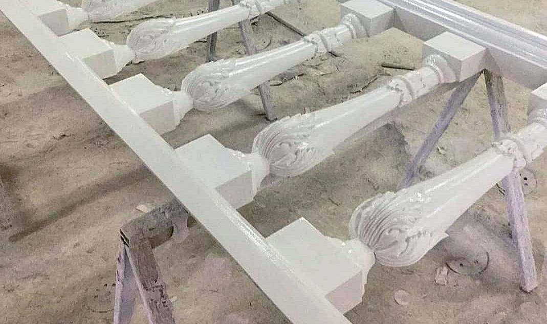 Окрашивание материала может производиться введением пигментов. Хотя, более выгодно установить фасадный декор и полимербетона на место и далее окрасить вместе с самим фасадом. Крепление осуществляется только анкерами или закладными деталями. Этот материал великолепно подходит для изготовления рельефных профилей (поясков, карнизов, наличников), а также, крупных фасадных элементов – капителей и баз колон, ваз, балясин. Такие изделия делают полыми для снижения веса и экономии материала, но прочность их настолько высокая, что повредить практически невозможно.