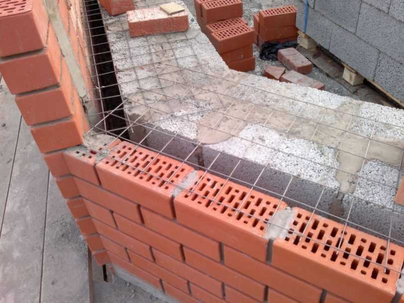 Оконные и дверные проемы нарушают целостность стены и снижают ее прочность. Поэтому над проемами устанавливают железобетонные перемычки. Далее укладывают кирпич по правилам возведения сплошной стены. На последний кирпичный ряд укладывают армированный пояс из сварной сетки и бетона. Он распределяет нагрузку над проемами и защищает от появления трещин. Сверху монтируют плиты перекрытия.