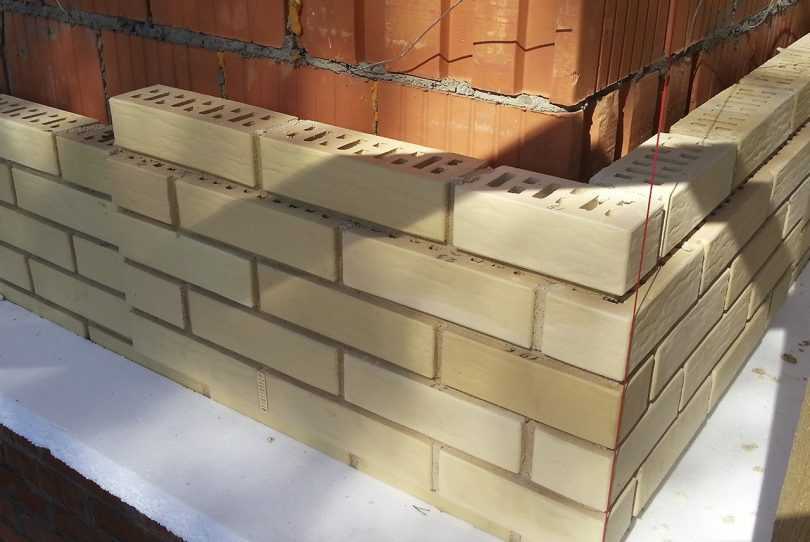 Укладки откосов. Когда стены выложены, вертикальным методом выкладывают кирпичом фасад вокруг окон и дверных проемов.
