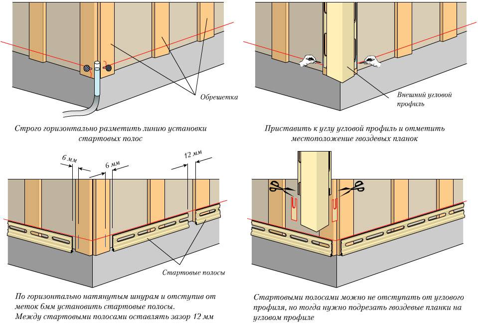 Важна правильная установка старта с соблюдением технологии работ. Обязательно проверяют горизонтальность элемента с помощью пузырькового уровня, а для разметки лучше подходит водяной трубчатый уровень или нивелир. Обрешетку под стартовый профиль для сайдинга делают так, чтобы он не изгибался в плоскости, иначе трудно будет защелкнуть на нем первую панель.