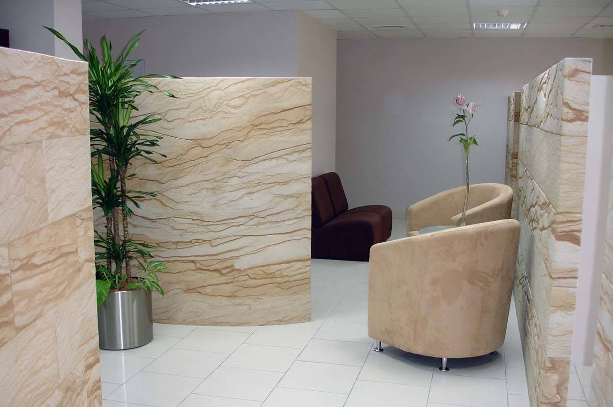 Смотрится гибкий камень в интерьере очень благородно и эффектно. Цветовая палитра достаточно многогранна и может начинаться от светло-бежевых и бело-серых тонов самого песчаника и заканчиваться розовым и желтым.