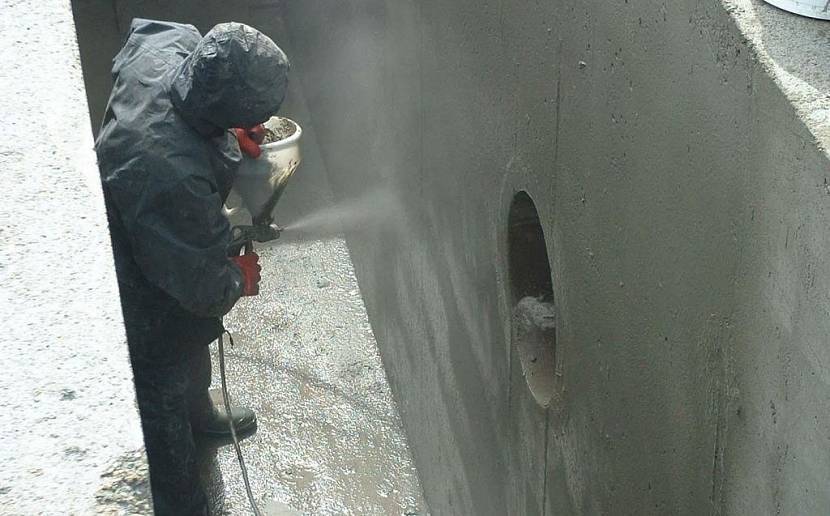 На очищенную поверхность от пыли и грязи с помощью распылителя наносится полимочевина. Состав из смолы и изоцианата создаёт прочную плёнку, которая не пропускает воду. Изделие хорошо фиксируется на бетоне. Напыление выполняется несколько раз.