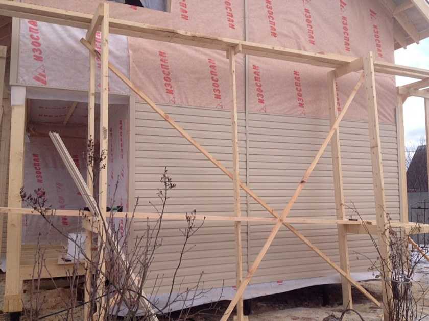 На обрешетку будет впоследствии устанавливаться сайдинг. Панели оставляют зазор для вентиляции воздуха и утеплитель. Весь фасад обтягивается пленкой со свойством пароизоляции. Настил начинается с верхней части. Осуществляется фиксация через каждые 30 см. небольшое провисание только в плюс. Смежные полосы должны укладываться только внахлест. После чего проклеиваются специальной лентой.