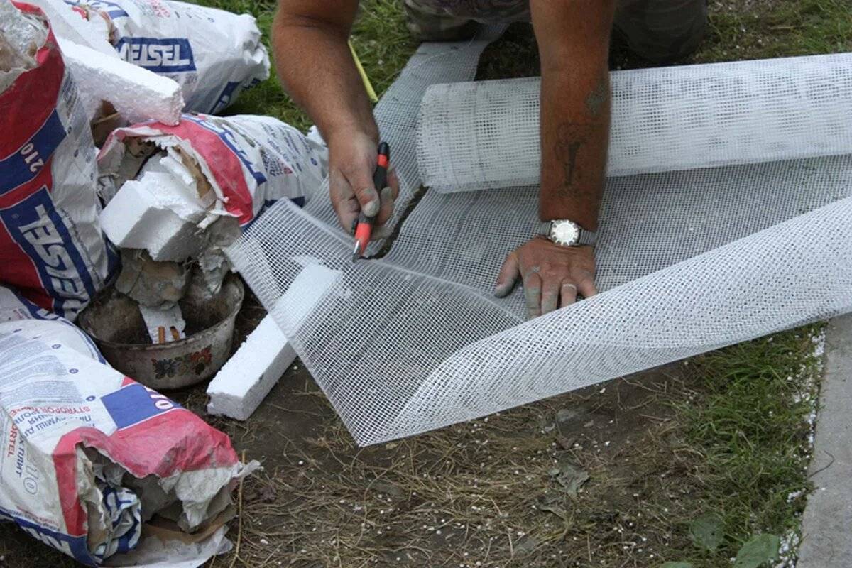 Армирующий каркас небольшой толщины закрепляют с помощью монтажной ленты. Для плетеных сеток потребуются саморезы или дюбели, если стена бетонная. Перед монтажом материал раскраивают на отрезки нужного размера. Расстояние между креплениями зависит от веса сетчатого полотна, размера ячеек. Максимальное расстояние – 40 см.