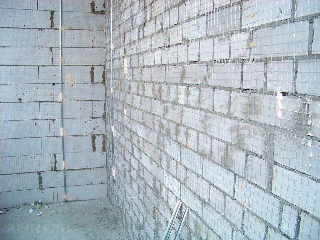 - По аналогичной схеме вывести смежную стену, а затем приступить к штукатурным работам. На начальном этапе требуется заделать трещины, уложив армирующую сетку. Крупные щели (например между плитами) можно заполнить монтажной пеной, выступившие излишки срезать после полимеризации. Если на стенах имеются металлические элементы, то их следует демонтировать или замазать краской или антикоррозионной мастикой. При нарушении правила на штукатурке появятся пятна от ржавчины, которые перейдут на финишную отделку.