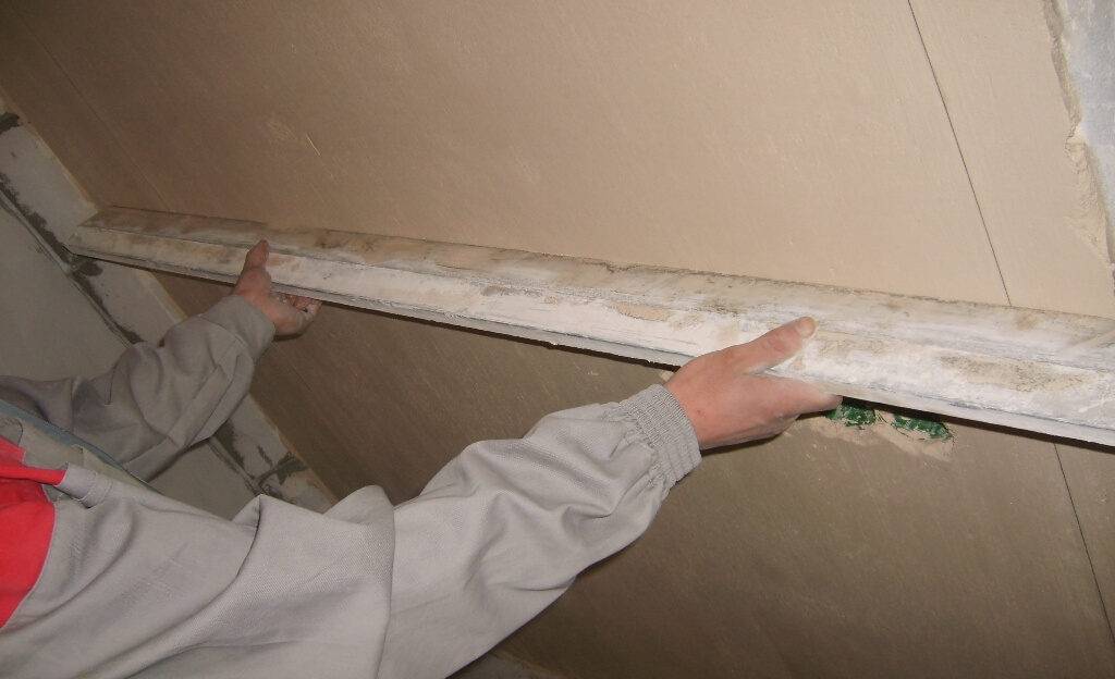 Теперь, когда штукатурка штукатурный раствор приготовлен, можно приступить к самой штукатурке потолка. Это относительно несложный процесс, однако он требует терпения. Суть процесса заключается в нанесении раствора на потолок и разравнивании с помощью правила.