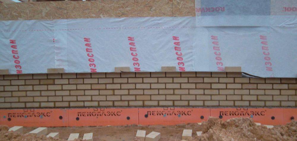 Поверх утеплителя закрепляют гидроизоляцию и ветрозащиту. Крепление осуществляют на строительный степлер. После такой подготовки приступают непосредственно к обкладке дома кирпичом.