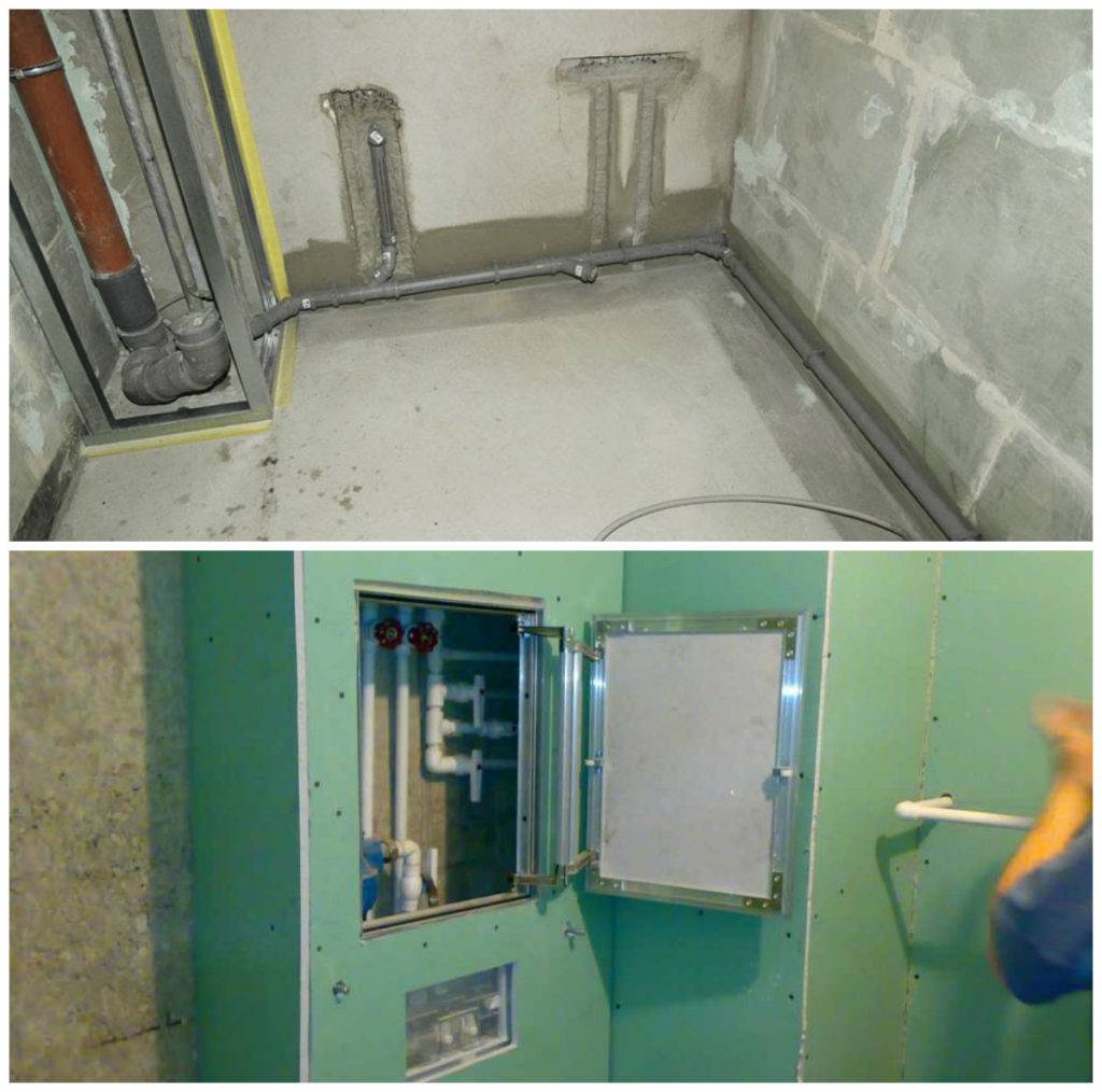 Чаще всего используется комбинированный способ: на тех стенах где есть трубы канализации, стояки, краны, делается каркас из ГКЛ, там где скрывать нечего – штукатурка. Тонкие трубы (подводы к раковине, унитазу, полотенцесушителю) лучше вмуровать в стену и заштукатурить, это намного дешевле и сохранит много пространства. Есть специальные тонкие трубы канализации, диаметром 32 мм, для подведения в стене, например, к рукомойнику или стиральной машине.