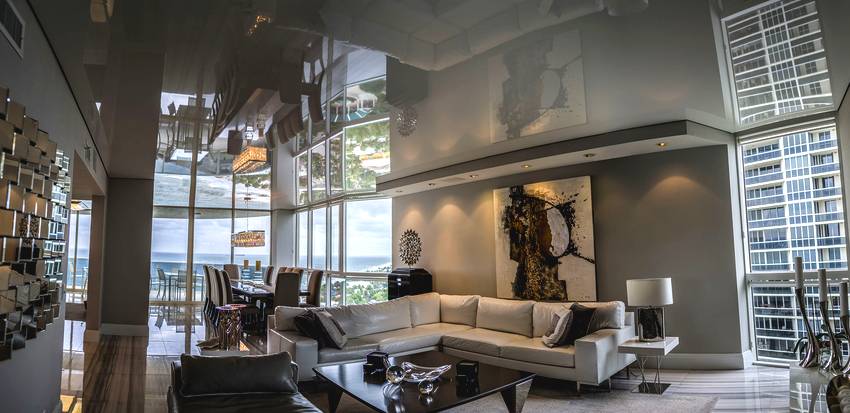 1. Глянцевое полотно, иначе называемое лаковым, применяют для оформления самых разных помещений. Несмотря на свой яркий блеск, оно отлично смотрится даже в классических интерьерах. Учтите, что отражающие свойства помогают визуально увеличить комнату.
