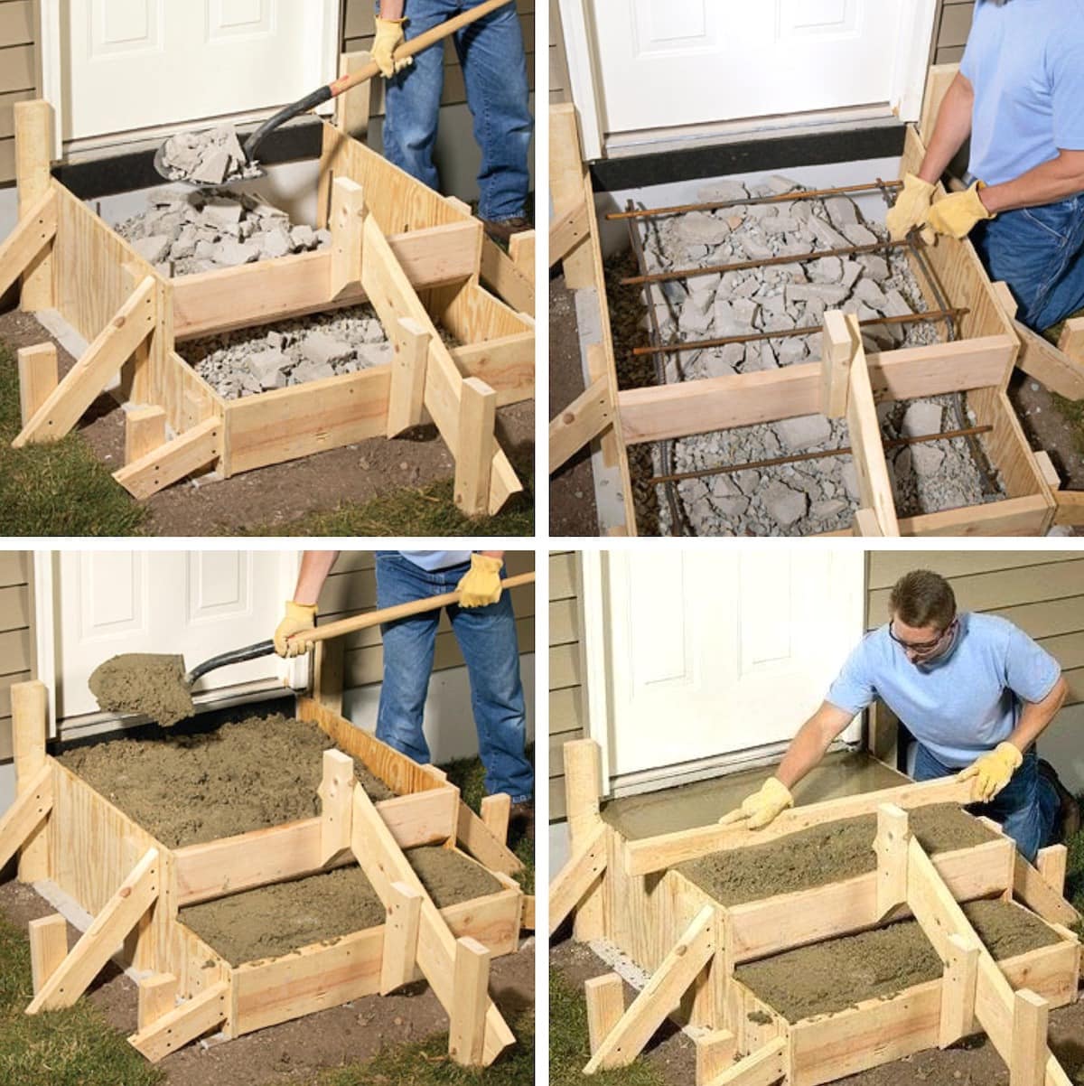 Для укрепления рекомендуется подпереть укосами. Чтобы армирующий каркас булл надежно укреплен бетоном со всех сторон, на дно рекомендуется уложить камешки. После укладывается арматура, которую необходимо прочно связать проволокой. Для заливки конструкции используется бетонная смесь. Через 7—10 дней обрамляющие опалубку деревянные опоры снимаются. Приступить к следующему строительному этапу по сооружению самого крылечка.