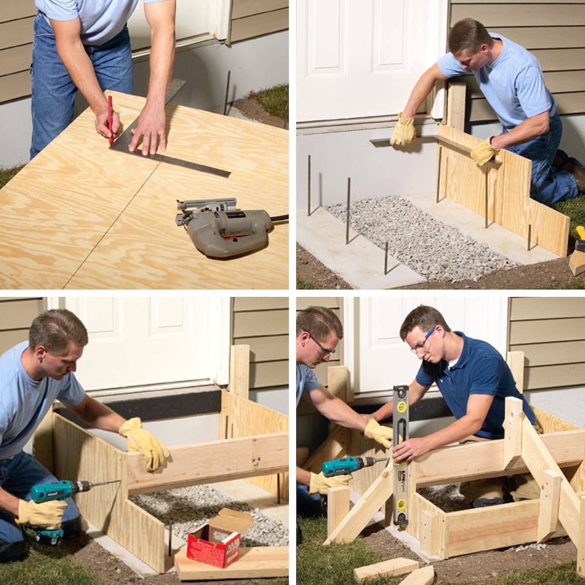 На фото показано как правильно из фанеры и досок собирать опалубку для крыльца