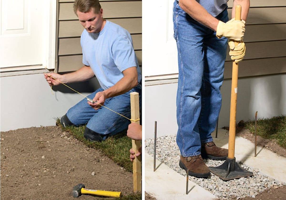 Если же возможности углубить фундамент на расстояние, идентичное фундаменту дома, нет, то достаточно будет выкопать траншею глубиной в 20 см, но ни в коем случае не меньше! Не забудьте предварительно сделать разметку фундамента с помощью колышек и натянутых веревок, учитывая рекомендуемую ширину крыльца – на 30-60 см больше ширины входной двери.