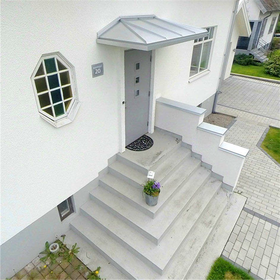 Отделывают подобные конструкции клинкерной плиткой, камнем. Их штукатурят и окрашивают. Если фасад дома выполнен кирпичным или деревянным, бетонный вход часто оставляют без внешнего покрытия, подчеркивая общую статичную уравновешенную композицию.