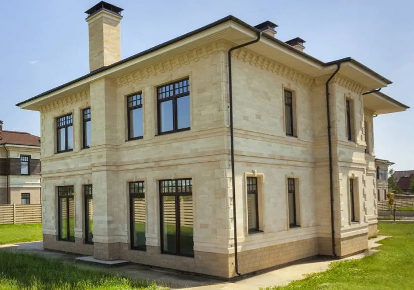 Пористая структура камня впитывает копоть, грязь от выхлопных газов автомобилей. Если дом расположен вблизи автострады или шумных улиц, от компании-исполнителя понадобится грамотный подбор способа обработки плит с заполнением каверн. Если подрядчик справится с этой задачей на «пять с плюсом», проблемы преждевременного загрязнения фасада не будет. Да и уход не потребует существенных вложений по времени.