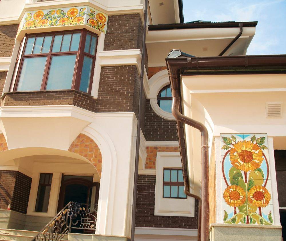 Керамические вставки встречаются в отделке панельных домов, в 60-70-х годах в период массового строительства знаменитых «хрущевок», мозаика применялась не только как декоративный элемент, но и несла защитную функцию панелей. Конечно, о художественном искусстве речь не велась, но применение подобных плит выгодно выделяли дома из общей серой массы. Позже керамическая плитка перекочевала в оформление внутренней отделки стен и бассейнов, но благодаря дизайнерам фасадная мозаика вновь стала востребованной для наружных фасадных работ. Если ранее применялась глазурованная и неглазурованная плитка, то теперь благодаря современным технологиям качество фасадной мозаики для наружной отделки значительно изменилось. Она приобрела состаренный вид с многочисленными трещинками, разводами, вкраплениями, и при этом, не потеряла прочности и актуальности. Такая фактура востребована на рынке отделочных материалов, позволяя реализовать самую нескромную фантазию.