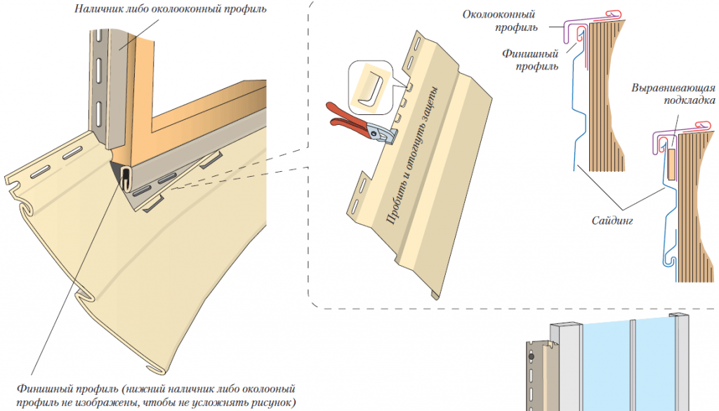 В нижнюю обвязку проема вставляют дополнительный финишный профиль, чтобы выровнять сайдинг в плоскости, так как глубина подрезки панелей зависит от высоты расположения проема на фасаде и может варьировать.